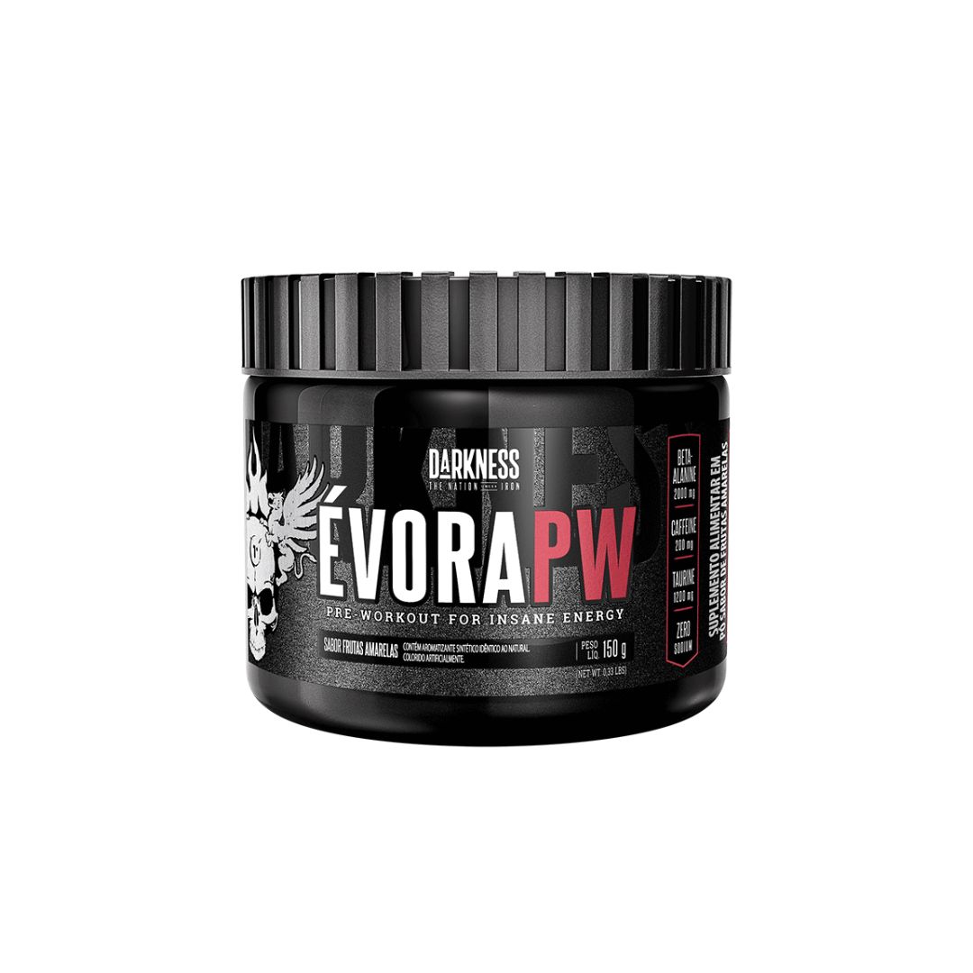ÉVORA PW Darkness é um pré-treino desenvolvido para favorecer a realização de treinos de força em alta intensidade. Com fórmula energizante, garante melhora da condição física e do desgaste mental, pontos primordiais para bodybuilders que querem sempre dar um "passo a diante" em sua forma física ou no desempenho.